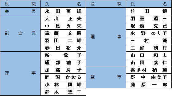 - 会長永田英雄の他副会長5名、理事14名、監事3名で運営しています。